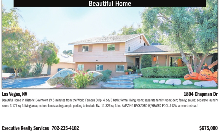 Las Vegas, NV 1804 Chapman Dr Beautiful Home in Historic Downtown LV 5 minutes from the Wortd Famous Strip. 4 bd/3 bath; formal living room; separate family room; den; family; sauna; separate laundry room: 3,177 sq ft living area; mature landscaping; ample parking to include RV. 11,326 sq ft lot: AMAZING BACKYARD W/HEATED POOL & SPA: a resort retreat! Executive Realty Services 702-235-4102 $675,000