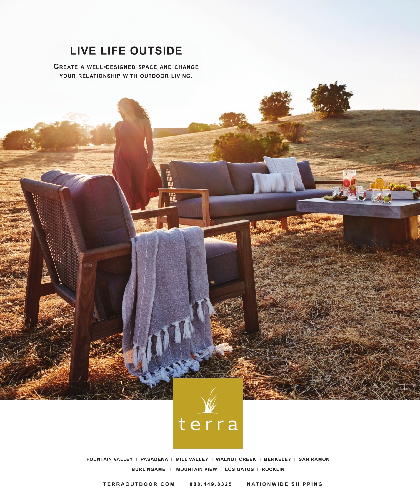 LIVE LIFE OUTSIDE CREATE A WELL-DESIGNED SPACE AND CHANGE YOUR RELATIONSHIP WITH OUTDOOR LIVING. FOUNTAIN VALLEY I PASADENA I MILL VALLEY I WALNUT CREEK I BERKELEY I SAN RAMON BURLINGAME I MOUNTAIN VIEW I LOS GATOS I ROCKLIN TERRAOUTDOOR.COM 888.449.8325 NATIONWIDE SHIPPING