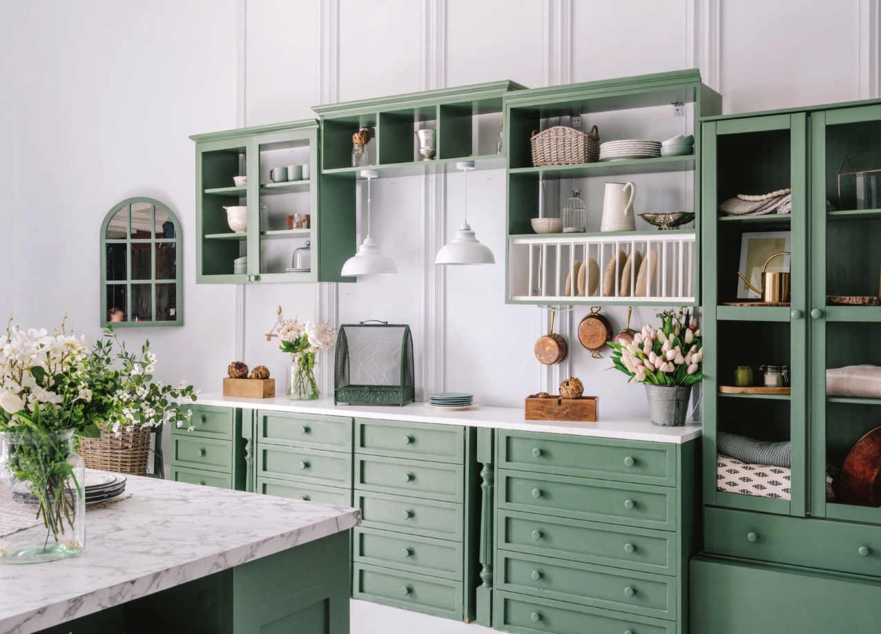 Green, says the survey. Green walls, tiles, cabinet faces and even artwork will makea big splash in kitchen and cabinet designs for 2022 and beyond. Not to be outdone, other cool colors like blues and grays will be introduced more thoroughly, and light wood grains will make their way back into the kitchen, both in natural wood surfaces and luxury vinyl plank flooring.