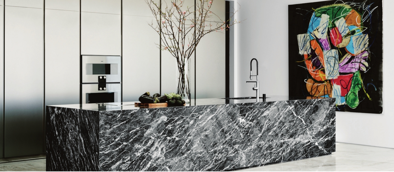 The kitchen was one of Chen’s biggest challenges. He wanted to create a space that truly works but keeps pace with the rest of the design rhythm. The main island is of solid marble complemented by sleek Dada cabinetry as well as built-in Gaggenau ovens, a full surface induction Vario cooktop and Gaggenau refrigeration. “Gaggenau is always the only choice when bringing together simple, sophisticated design and up-to-the-minute technology. For instance, something as simple, yet really important is the user interface. I love the user interface on the cooktop. The beautifully retro circular dials are so easy to use and the ability to havea full surface cooktop is amazing. I can place my cookware any place on the top and it senses the placement. Truly the best combination of simplicity and super sophistication.”
