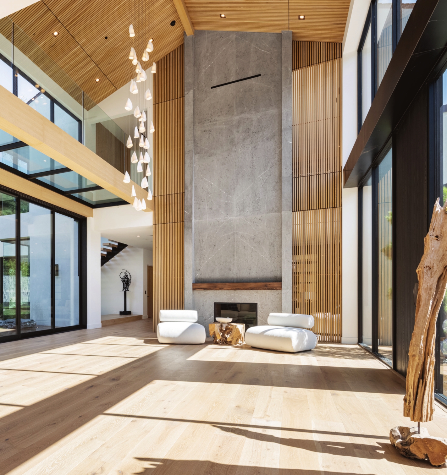 Upon entrance to the Encino home dubbed ŌNIN, visitors find themselves looking up and through the impressive “butterfly pavilion” behind the 12-foot-tall entry door. The impressive installation of marble, light and air welcomes people into the home and givesa clue as to what lies ahead – bold, uncommon choices in construction materials, layouts and methodology making the structure less utilitarian function and closer to livable art installation. Jae Omar’s sweeping design for the home features touches like narrow oak screening that camouflages rooms and doorways, lending to it a sense of mystery, like a 4,500-pound boulder functioning as a vanity. All of these bold, artistic choices combined witha true sanctuary feel as the home blends seamlessly into its surroundings create a point-of-place reminiscent of the Japanese era of influence for which the home is named and a way of wandering endlessly througha functional sculpture.