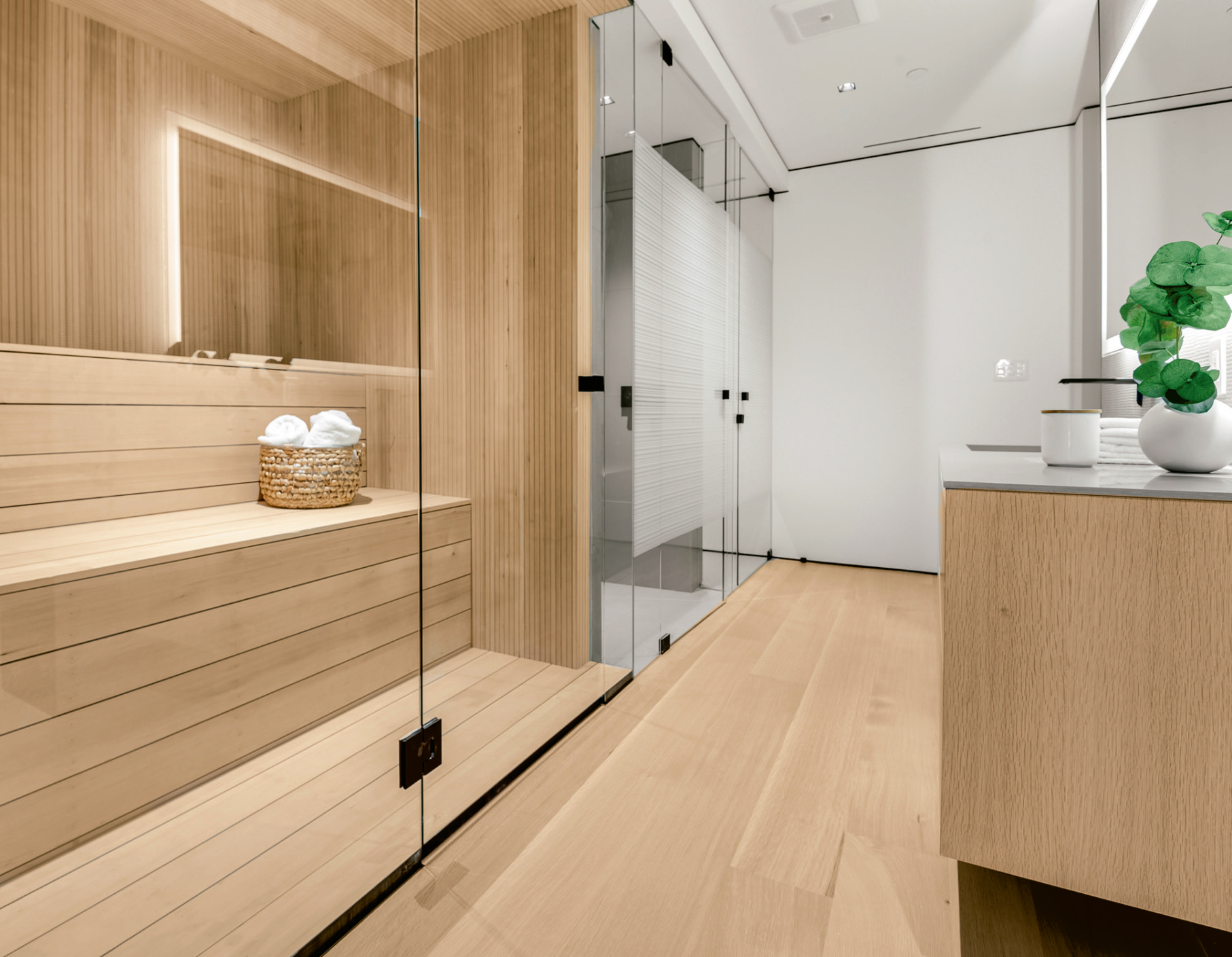 West Hollywood architectural firm Tag Front, well-known for their hospitality and residential designs, created standout Hazen II, which blends contemporary design with touches of beauty. Its multilevel environs blend into natural surroundings while the ultra-modern finishes create a futuristic look and feel. The sauna/steam room offers a spa-like getaway, with floor-to-ceiling glass partition walls adding depth and airiness to the room.