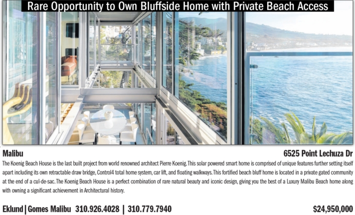 The Koenig Beach House is the last built project from world renowned architect Pierre Koenig. This solar powered smart home is comprised of unique features further setting itself apart including its own retractable draw bridge, Control4 total home system, car lift, and floating walkways. This fortified beach bluff home is located in a private gated community at the end of a cul-de-sac. The Koenig Beach House is a perfect combination of rare natural beauty and iconic design, giving you the best of a Luxury Malibu Beach home along with owning a significant achievement in Architectural history.