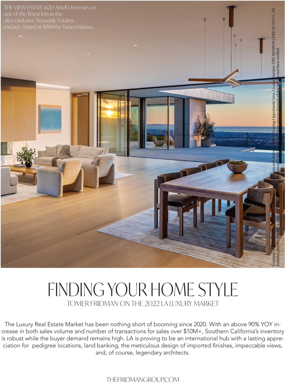 THE VIEW ESTATE (620 Arkell Drive) sits on one of the finest lots in the ultra-exclusive Trousdale Estates enclave. Listed at $88M by Tomer Fridman. FINDING YOUR HOME STYLE TOMER FRIDMAN ON THE 2022 LA LUXURY MARKET The Luxury Real Estate Market has been nothing short of booming since 2020. With an above 90% YOY increase in both sales volume and number of transactions for sales over $10M+, Southern California's inventory is robust while the buyer demand remains high. LA is proving to be an international hub with a lasting appreciation for pedigree locations, land banking, the meticulous design of imported finishes, impeccable views, and, of course, legendary architects. THEFRIDMANGROUP.COM