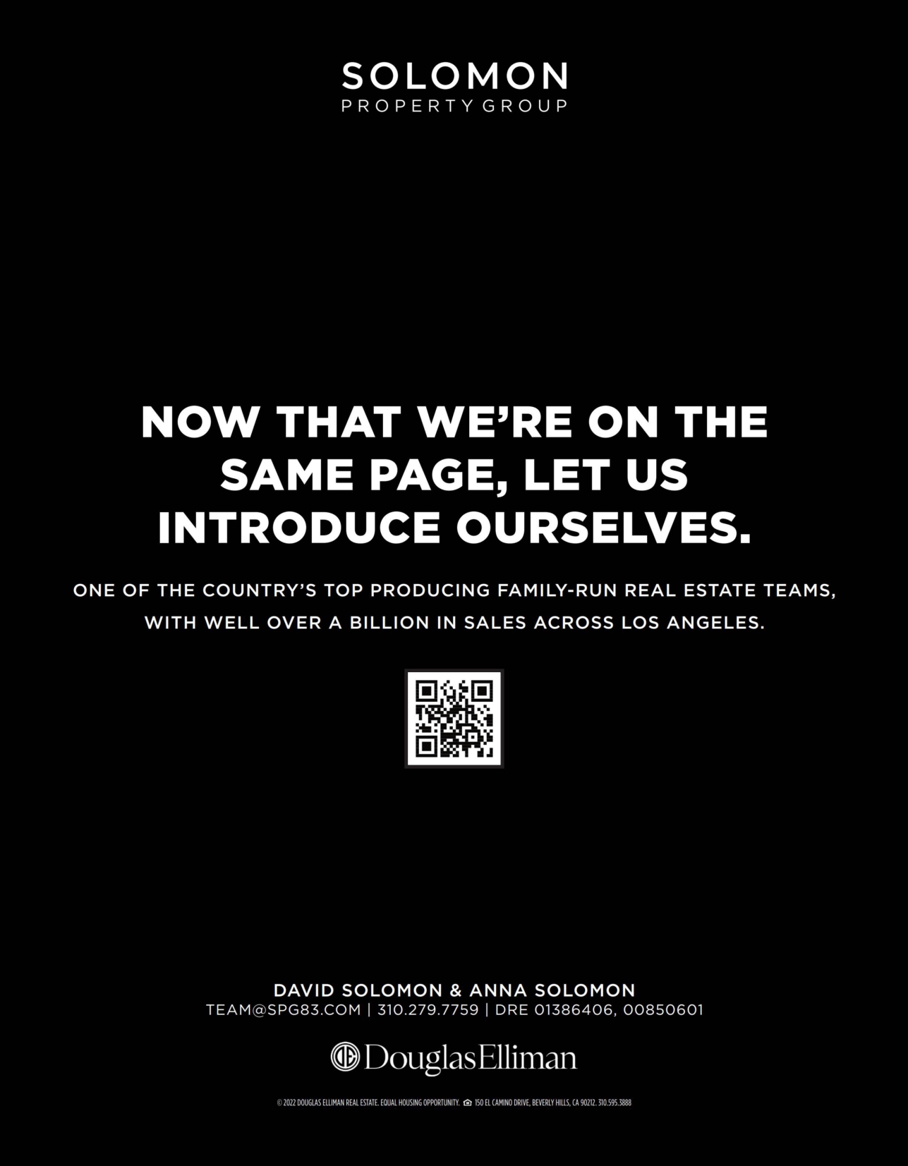 ONE OF THE COUNTRY’S TOP PRODUCING FAMILY-RUN REAL ESTATE TEAMS, WITH WELL OVER A BILLION IN SALES ACROSS LOS ANGELES. DAVID SOLOMON & ANNA SOLOMON TEAM@SPG83.COM | 310.279.7759 | DRE 01386406, 00850601 Douglas Elliman