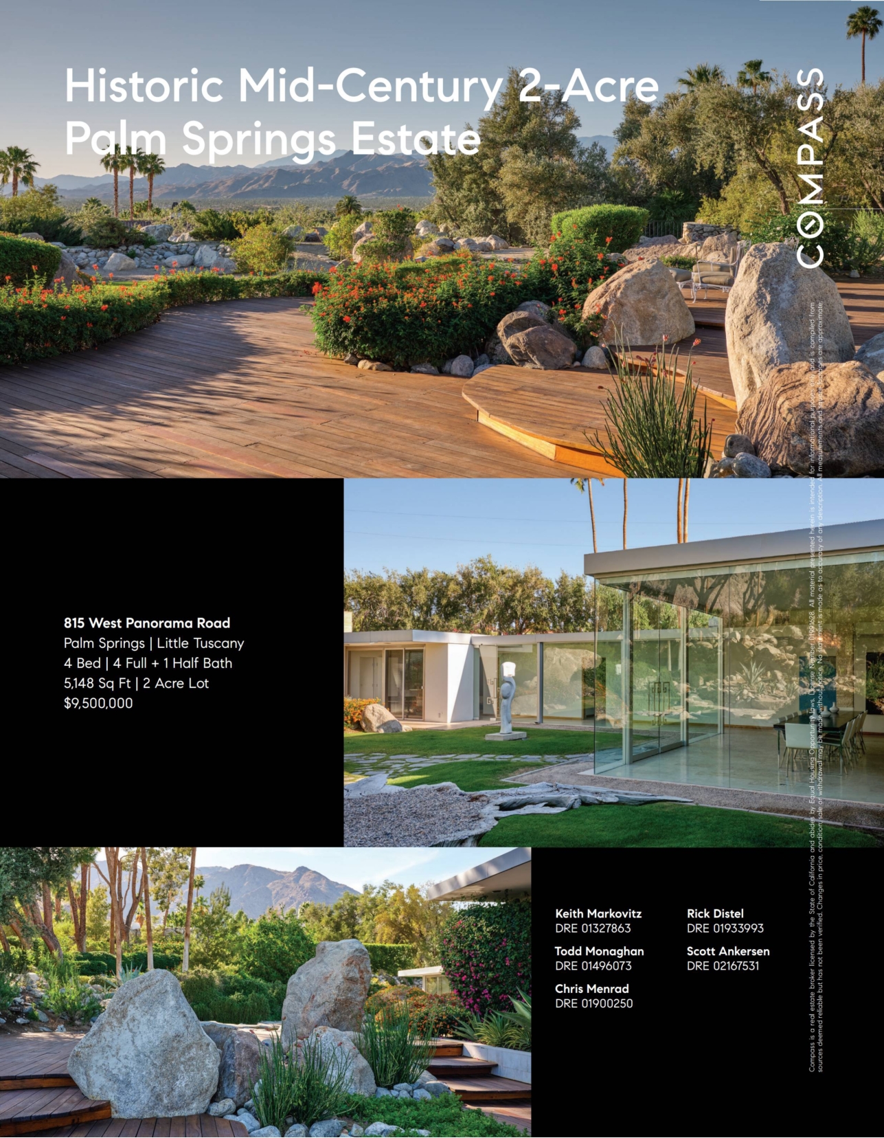Historic Mid-Century 2-Acre Palm Springs Estate815 West Panorama Road Palm Springs | Little Tuscany 4 Bed | 4 Full + 1 Half Bath 5,148 Sq Ft | 2 Acre Lot