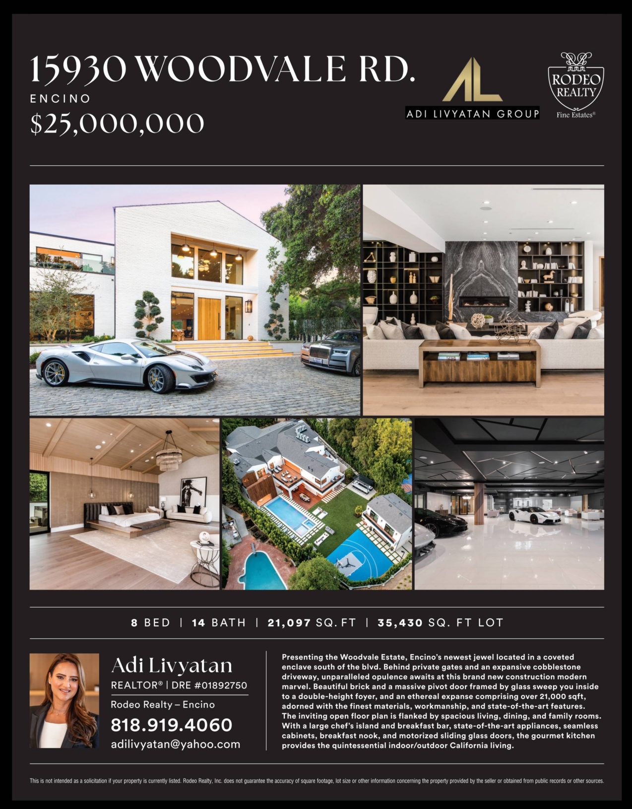 15930 WOODVALE RD. ENCINO $25,000,000 8 BED I 14 BATH I 21,097 SQ.FT I 35,430 SQ. FT LOT Adi Livyatan REALTOR® I DRE #01892750 Rodeo Realty-Encino 818.919.4060 adilivyatan@yahoo.com Presenting the Woodvale Estate, Encino’s newest jewel located in a coveted