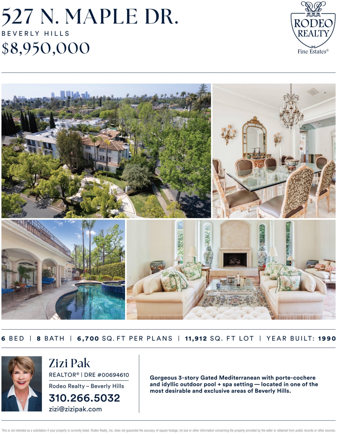 527 N. MAPLE DR. BEVERLY HILLS $8,950,0006 BED I 8 BATH I 6,700 SQ. FT PER PLANS I 11,912 SQ. FT LOT I YEAR BUILT: 1990 Zizi Pak REALTOR® I DRE #00694610 Rodeo Realty - Beverly Hills 310.266.5032 zizi@zizipak.com Gorgeous