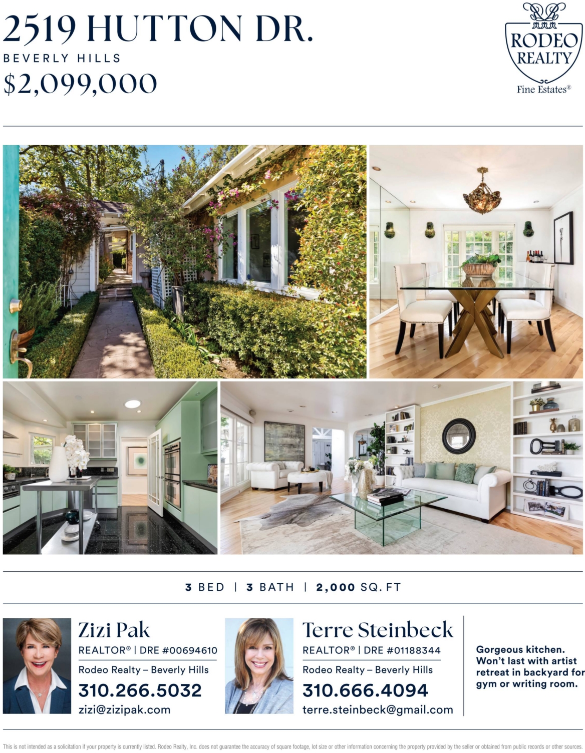 2519 HUTTON DR. BEVERLY HILLS $2,099,0003 BED I 3 BATH I 2,000 SQ. FT Zizi Pak REALTOR® I DRE #00694610 Rodeo Realty - Beverly Hills 310.266.5032 zizi@zizipak.com Terre Steinbeck REALTOR® I DRE #01188344 Rodeo Realty - Beverly Hills 310.666.4094 terre.steinbeck@gmail.com Gorgeous kitchen. Won’t last with artist retreat in backyard for gym or writing room.