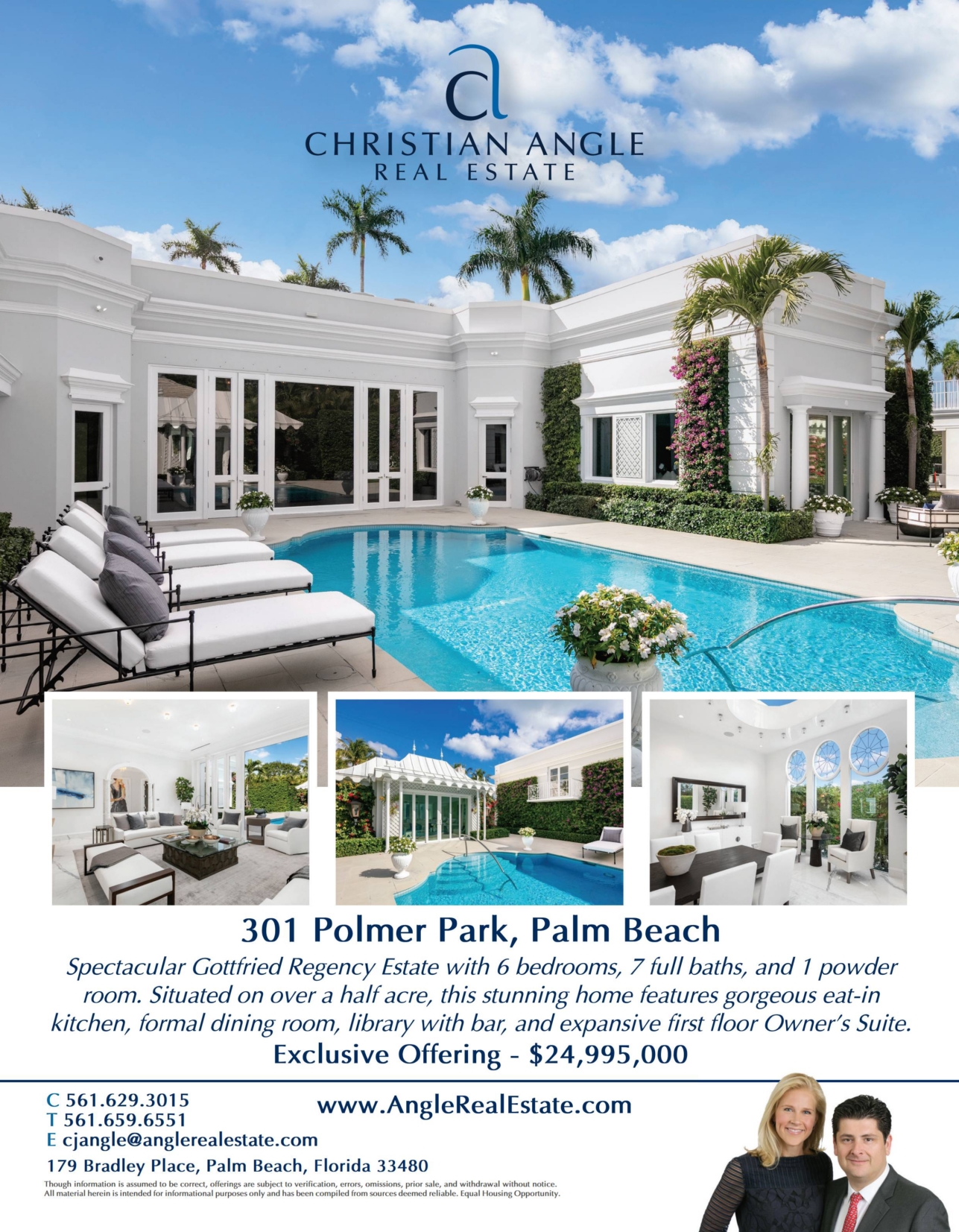 CHRISTIAN ANGLE REAL ESTATE 301 Polmer Park, Palm Beach Spectacular Gottfried Regency Estate with 6 bedrooms, 7 full baths, and 1 powder room. Situated on over a half acre, this stunning home features gorgeous eat-in kitchen, formal dining room, library with bar, and expansive first floor Owner's Suite. Exclusive Offering - $24,995,000 C 561.629.3015