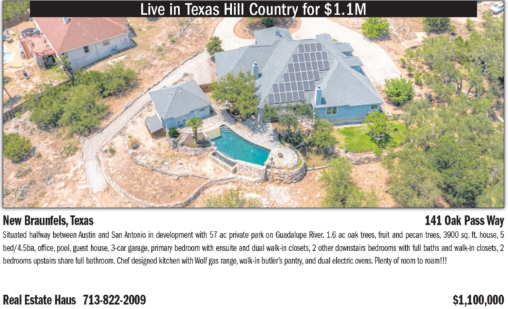 Situated halfway between Austin and San Antonio in development with 57 ac private park on Guadalupe River. 1.6 ac oak trees, fruit and pecan trees, 3900 sq. ft. house, 5 bed/4.5ba, office, pool, guest house, 3-car garage, primary bedroom with ensuite and dual walk-in closets, 2 other downstairs bedrooms with full baths and walk-in closets, 2 bedrooms upstairs share full bathroom. Chef designed kitchen with Wolf gas range, walk-in butler’s pantry, and dual electric ovens. Plenty of room to roam!!!