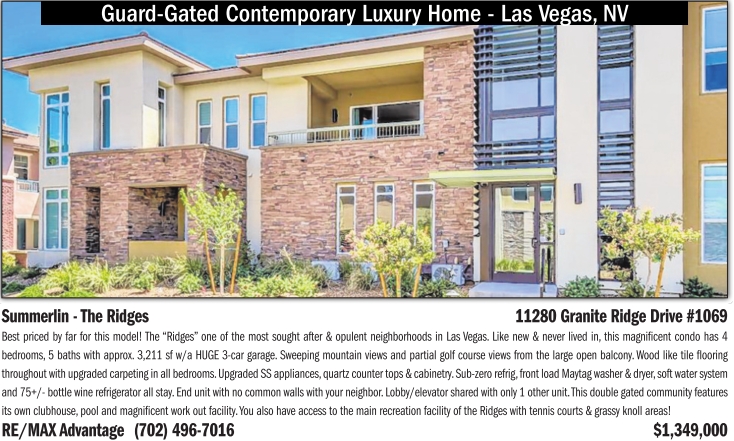 Guard-Gated Contemporary Luxury Home - Las Vegas, NV Summerlin - The Ridges 11280 Granite Ridge Drive #1069 Best priced by far for this model! The “Ridges” one of the most sought after & opulent neighborhoods in Las Vegas. Like new & never lived in, this magnificent condo has 4 bedrooms, 5 baths with approx. 3,211 sf w/a HUGE 3-car garage. Sweeping mountain views and partial golf course views from the large open balcony. Wood like tile flooring throughout with upgraded carpeting in all bedrooms. Upgraded SS appliances, quartz counter tops & cabinetry. Sub-zero refrig, front load Maytag washer & dryer, soft water system and 75+/- bottle wine refrigerator all stay. End unit with no common walls with your neighbor. Lobby/elevator shared with only 1 other unit. This double gated community features its own clubhouse, pool and magnificent work out facility. You also have access to the main recreation facility of the Ridges with tennis courts & grassy knoll areas! RE/MAX Advantage (702) 496-7016 $1,349,000