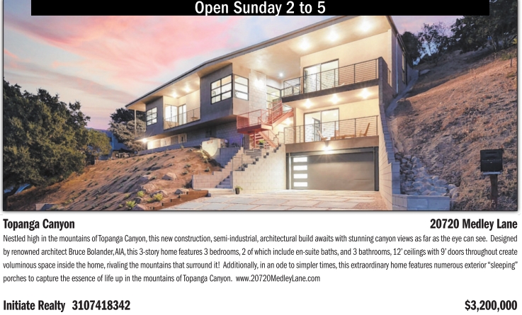 Open Sunday 2 to 5 Topanga Canyon 20720 Medley Lane Nestled high in the mountains of Topanga Canyon, this new construction,