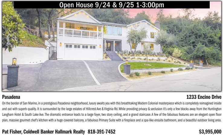 Open House 9/24 & 9/25 1-3:00pm Pasadena 1233 Encino Drive On the border of San Marino,in a prestigious Pasadena neighborhood, luxury awaits you with this breathtaking Modern Colonial masterpiece which is completely reimagined inside and out with superb quality. It is surrounded by the large estates of Hillcrest Ave & Virginia Rd. While providing privacy & seclusion it’s only a few blocks away from the Huntington Langham Hotel & South Lake Ave. The dramatic entrance leads to a large foyer, two story ceiling, and a grand staircase. A few of the fabulous features are an elegant open floor plan, massive gourmet chef’s kitchen with a huge covered balcony, a fabulous Primary Suite with a fireplace and a spa-like ensuite bathroom, and a beautiful outdoor living area. Pat Fisher, Coldwell Banker Hallmark Realty 818-391-7452 $3,995,000