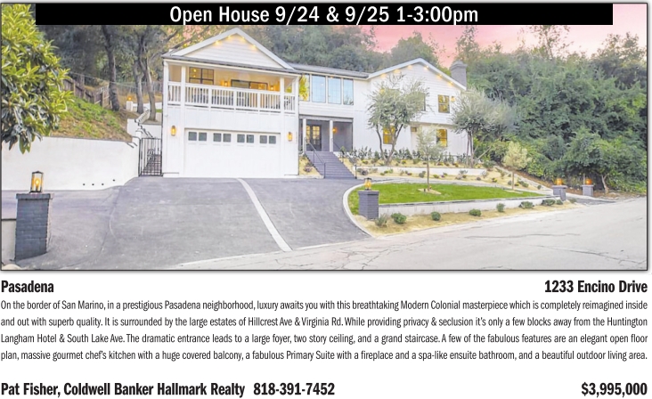 Open House 9/24 & 9/25 1-3:00pm Pasadena 1233 Encino Drive On