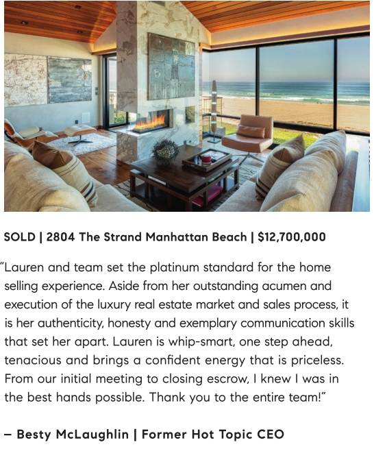 SOLD | 2804 The Strand Manhattan Beach | $12,700,000 “Lauren and team set the platinum standard for the home selling experience. Aside from her outstanding acumen and execution of the luxury real estate market and sales process, it is her authenticity, honesty and exemplary communication skills that set her apart. Lauren is whip-smart, one step ahead, tenacious and brings a confident energy that is priceless. From our initial meeting to closing escrow, I knew I was in the best hands possible. Thank you to the entire team!” – Besty McLaughlin | Former Hot Topic CEO