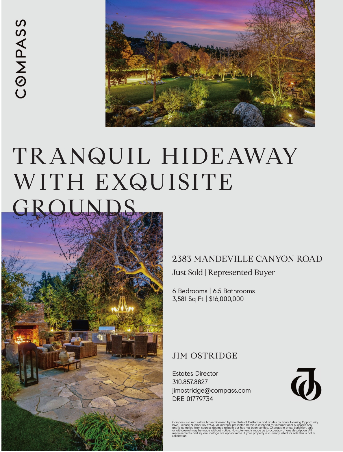 TRANQUIL HIDE AWAY WITH EXQUISITE GROUNDS 2383 MANDEVILLE CANYON ROAD Just Sold | Represented Buyer 6 Bedrooms | 6.5 Bathrooms 3,581 Sq Ft | $16,000,000 JIM OSTRIDGE Estates Director 310.857.8827