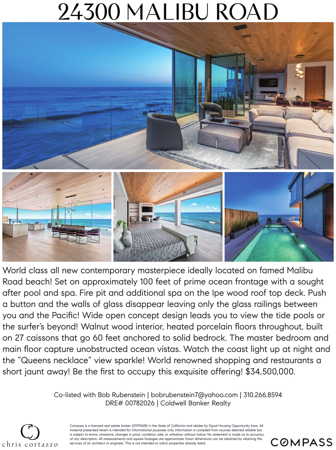 24300 MALIBU ROAD World class all new contemporary masterpiece ideally located on famed Malibu Road beach! Set on approximately 100 feet of prime ocean frontage with a sought after pool and spa. Fire pit and additional spa on the Ipe wood roof top deck. Push a button and the walls of glass disappear leaving only the glass railings between you and the Pacific! Wide open concept design leads you to view the tide pools or the surfer’s beyond! Walnut wood interior, heated porcelain floors throughout, built on 27 caissons that go 60 feet anchored to solid bedrock. The master bedroom and main floor capture unobstructed ocean vistas. Watch the coast light up at night and the “Queens necklace” view sparkle! World renowned shopping and restaurants a short jaunt away! Be the first to occupy this exquisite offering! $34,500,000. Co-listed with Bob Rubenstein | bobrubenstein7@yahoo.com | 310.266.8594 DRE# 00782026 | Coldwell Banker Realty Compass is a licensed real estate broker (01991628) in the State of California and abides by Equal Housing Opportunity laws. All material presented herein is intended for informational purposes only. Information is compiled from sources deemed reliable but is subject to errors, omissions, changes in price, condition, sale, or withdraw without notice. No statement is made as to accuracy of any description. All measurements and square footages are approximate. Exact dimensions can be obtained by retaining the services of an architect or engineer. This is not intended to solicit properties already listed.
