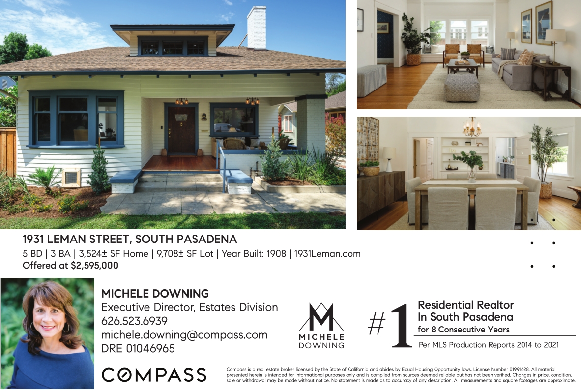 DRE 01046965 #1 Residential Realtor In South Pasadena Residential Realtor In South Pasadena Per 8MLS Consecutive Production Years Reports 2014 to 2021 Per MLS Production Reports 2014 to 2021 Compass is a real estate broker licensed by the State of California and abides by Equal Housing Opportunity laws. License Number 01991628. All material presented herein is intended for informational purposes only and is compiled from sources deemed reliable but has not been verified. Changes in price, condition, sale or withdrawal may be made without notice. No statement is made as to accuracy of any description. All measurements and square footages are approximate.