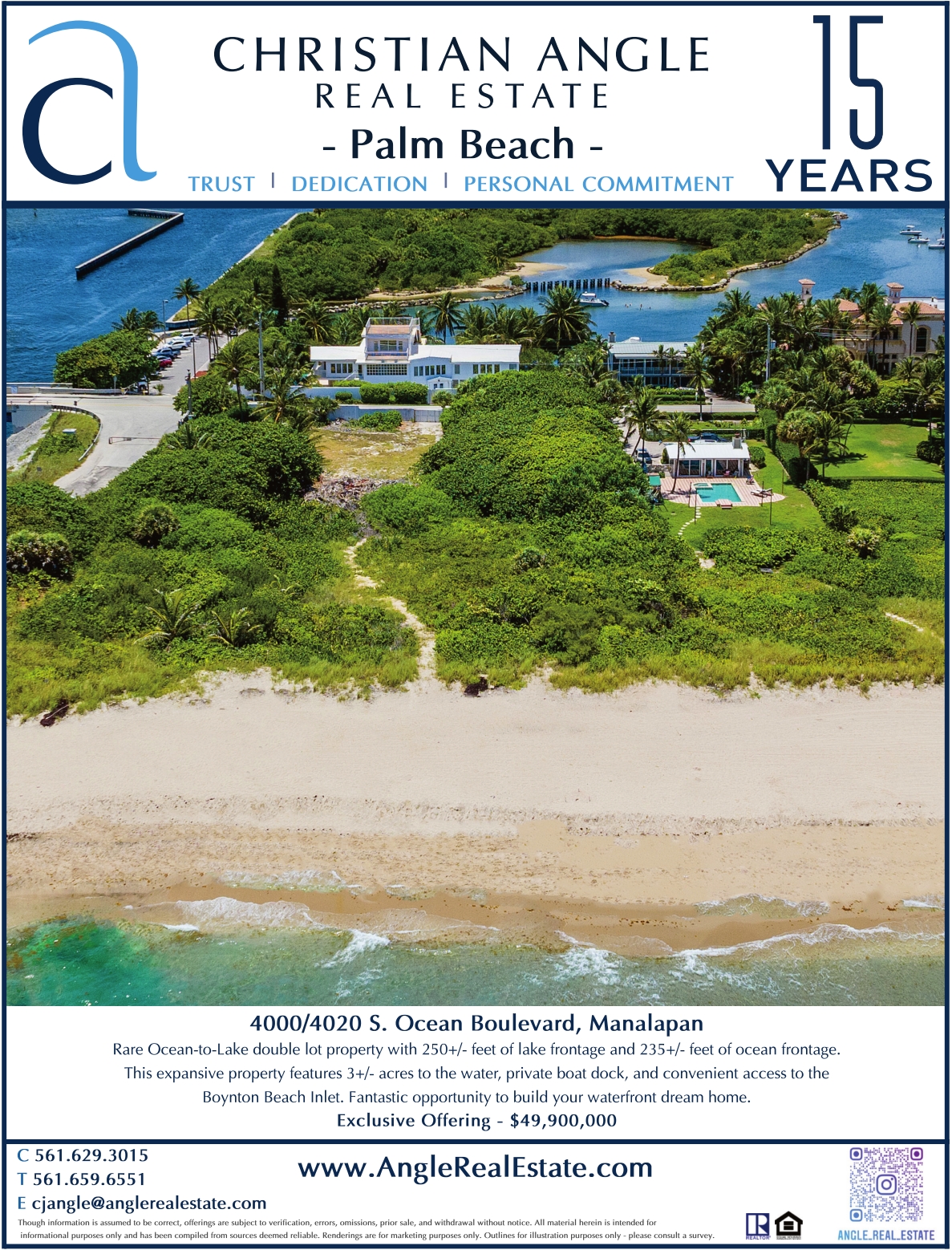 CHRISTIAN ANGLE REAL ESTATE - Palm Beach - TRUST | DEDICATION | PERSONAL COMMITMENT 4000/4020 S. Ocean Boulevard, Manalapan Rare Ocean-to-Lake double lot property with 250+/- feet of lake frontage and 235+/- feet of ocean frontage. This expansive property features 3+/- acres to the water, private boat dock, and convenient access to the Boynton Beach Inlet. Fantastic opportunity to build your waterfront dream home. Exclusive Offering - $49,900,000 C 561.629.3015 T 561.659.6551 E cjangle@anglerealestate.com www.AngleRealEstate.com Though information is assumed to be correct, offerings are subject to verification, errors, omissions, prior sale, and withdrawal without notice. All material herein is intended for informational purposes only and has been compiled from sources deemed reliable. Renderings are for marketing purposes only. Outlines for illustration purposes only - please consult a survey.