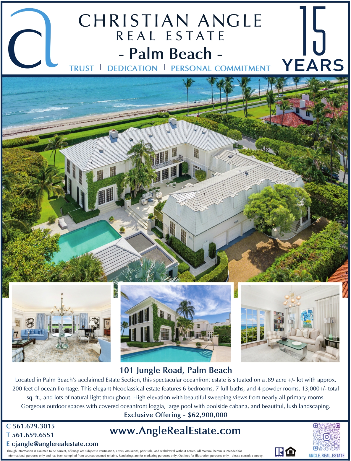CHRISTIAN ANGLE REAL ESTATE - Palm Beach - TRUST | DEDICATION | PERSONAL COMMITMENT C 561.629.3015 T 561.659.6551 E cjangle@anglerealestate.com 101 Jungle Road, Palm Beach Located in Palm Beach’s acclaimed Estate Section, this spectacular oceanfront estate is situated on a .89 acre +/- lot with approx. 200 feet of ocean frontage. This elegant Neoclassical estate features 6 bedrooms, 7 full baths, and 4 powder rooms, 13,000+/- total sq. ft., and lots of natural light throughout. High elevation with beautiful sweeping views from nearly all primary rooms. Gorgeous outdoor spaces with covered oceanfront loggia, large pool with poolside cabana, and beautiful, lush landscaping. Exclusive Offering - $62,900,000 www.AngleRealEstate.com Though information is assumed to be correct, offerings are subject to verification, errors, omissions, prior sale, and withdrawal without notice. All material herein is intended for informational purposes only and has been compiled from sources deemed reliable. Renderings are for marketing purposes only. Outlines for illustration purposes only - please consult a survey.