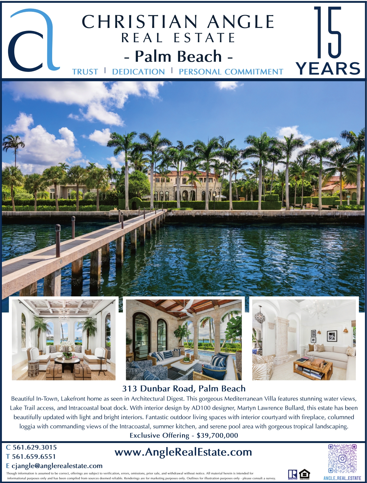 CHRISTIAN ANGLE REAL ESTATE - Palm Beach - TRUST | DEDICATION | PERSONAL COMMITMENT C 561.629.3015 T 561.659.6551 E cjangle@anglerealestate.com 313 Dunbar Road, Palm Beach Beautiful In-Town, Lakefront home as seen in Architectural Digest. This gorgeous Mediterranean Villa features stunning water views, Lake Trail access, and Intracoastal boat dock. With interior design by AD100 designer, Martyn Lawrence Bullard, this estate has been beautifully updated with light and bright interiors. Fantastic outdoor living spaces with interior courtyard with fireplace, columned loggia with commanding views of the Intracoastal, summer kitchen, and serene pool area with gorgeous tropical landscaping. Exclusive Offering - $39,700,000 www.AngleRealEstate.com Though information is assumed to be correct, offerings are subject to verification, errors, omissions, prior sale, and withdrawal without notice. All material herein is intended for informational purposes only and has been compiled from sources deemed reliable. Renderings are for marketing purposes only. Outlines for illustration purposes only - please consult a survey.