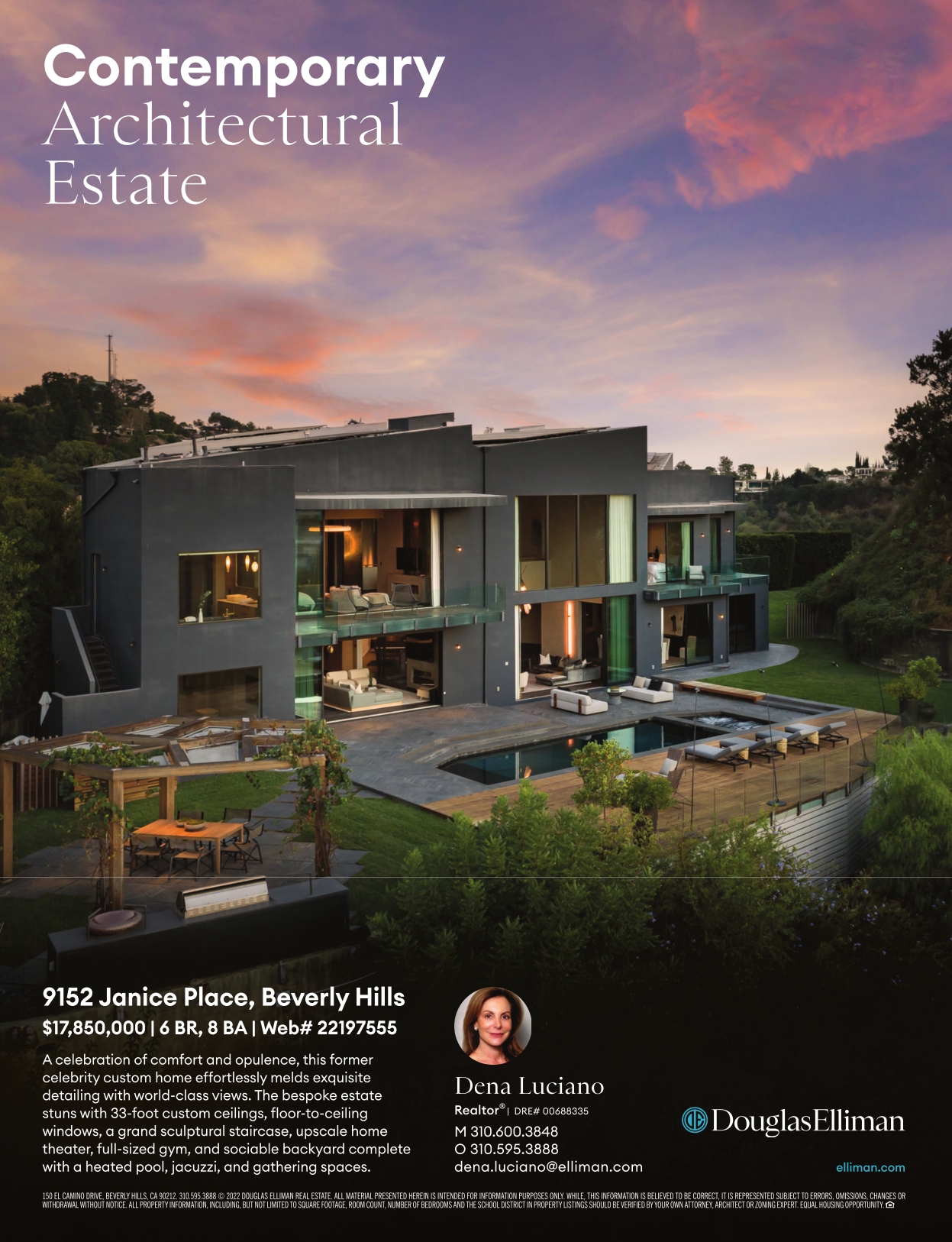 Contemporary Architectural Estate 9152 Janice Place, Beverly Hills $17,850,000 | 6 BR, 8 BA | Web# 22197555 A celebration of comfort and opulence, this former celebrity custom home e ortlessly melds exquisite detailing with world-class views. The bespoke estate stuns with 33-foot custom ceilings, floor-to-ceiling windows, a grand sculptural staircase, upscale home theater, full-sized gym, and sociable backyard complete with a heated pool, jacuzzi, and gathering spaces. Dena Luciano Realtor ® | DRE# 00688335 M 310.600.3848