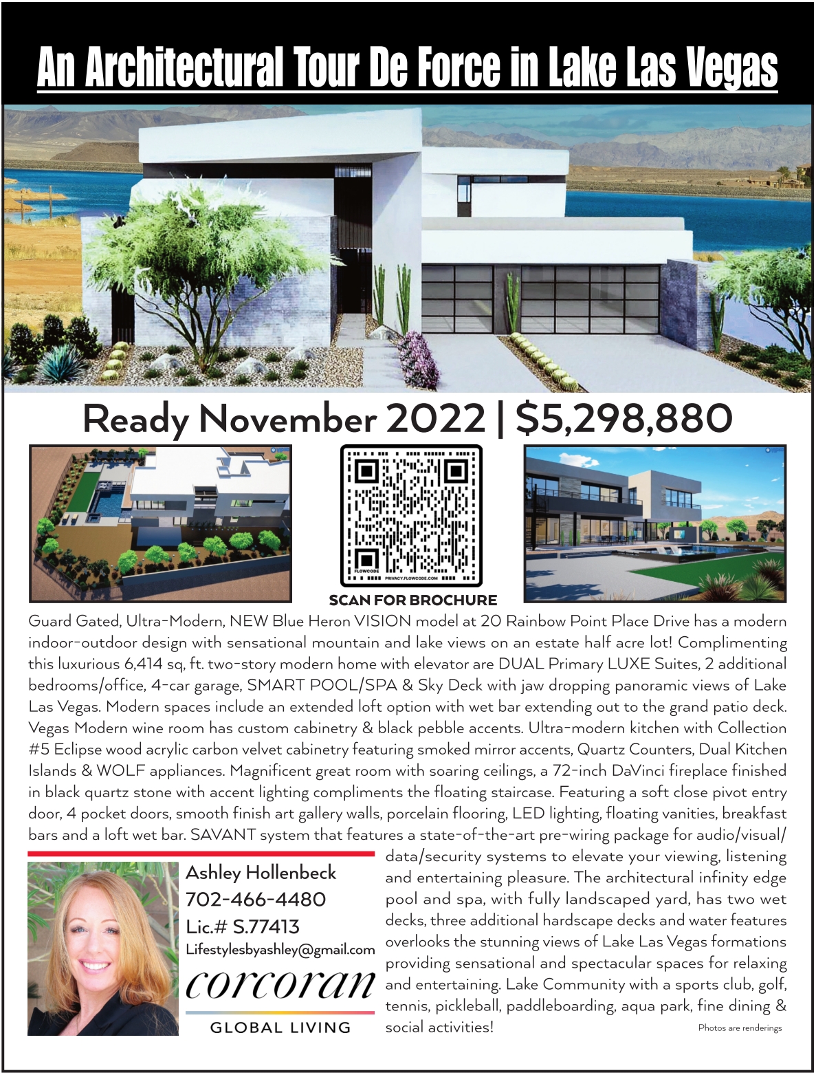 An Architectural Tour De Force in Lake Las Vegas Ready November 2022 | $5,298,880 SCAN FOR BROCHURE Guard Gated, Ultra-Modern, NEW Blue Heron VISION model at 20 Rainbow Point Place Drive has a modern indoor-outdoor design with sensational mountain and lake views on an estate half acre lot! Complimenting this luxurious 6,414 sq, ft. two-story modern home with elevator are DUAL Primary LUXE Suites, 2 additional bedrooms/office, 4-car garage, SMART POOL/SPA & Sky Deck with jaw dropping panoramic views of Lake Las Vegas. Modern spaces include an extended loft option with wet bar extending out to the grand patio deck. Vegas Modern wine room has custom cabinetry & black pebble accents. Ultra-modern kitchen with Collection #5 Eclipse wood acrylic carbon velvet cabinetry featuring smoked mirror accents, Quartz Counters, Dual Kitchen Islands & WOLF appliances. Magnificent great room with soaring ceilings, a 72-inch DaVinci fireplace finished in black quartz stone with accent lighting compliments the floating staircase. Featuring a soft close pivot entry door, 4 pocket doors, smooth finish art gallery walls, porcelain flooring, LED lighting, floating vanities, breakfast bars and a loft wet bar. SAVANT system that features a state-of-the-art pre-wiring package for audio/visual/data/security systems to elevate your viewing, listening and entertaining pleasure. The architectural infinity edge pool and spa, with