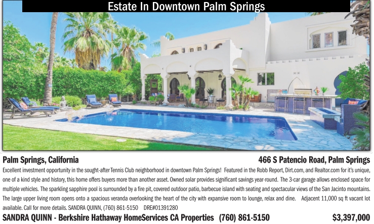 SANDRA QUINN, (760) 861-5150 DRE#01391280 SANDRA QUINN - Berkshire Hathaway HomeServices CA Properties (760) 861-5150 $3,397,000