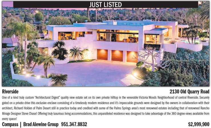 JUST LISTED Riverside 2130 Old Quarry Road One of a kind truly custom “Architectural Digest” quality view estate set on its own private hilltop in the venerable Victoria Woods Neighborhood of central Riverside. Securely gated on a private drive this exclusive enclave consisting of a timelessly modern residence and it’s impeccable grounds were designed by the owners in collaboration with their architect, Richard Holden of Palm Desert still in practice today and credited with some of the Palms Springs area’s most renowned estates including that of renowned Rancho Mirage Designer Steve Chase! Offering truly luxurious living accommodations, this unparalleled residence was designed to take advantage of the 360 degree views available from every space! Compass | Brad Alewine Group 951.347.8832 $2,999,900