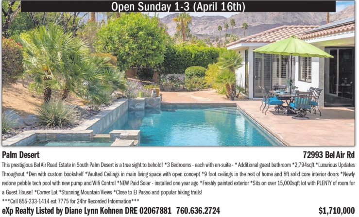 Listed by Diane Lynn Kohnen DRE 02067881 760.636.2724 $1,710,000