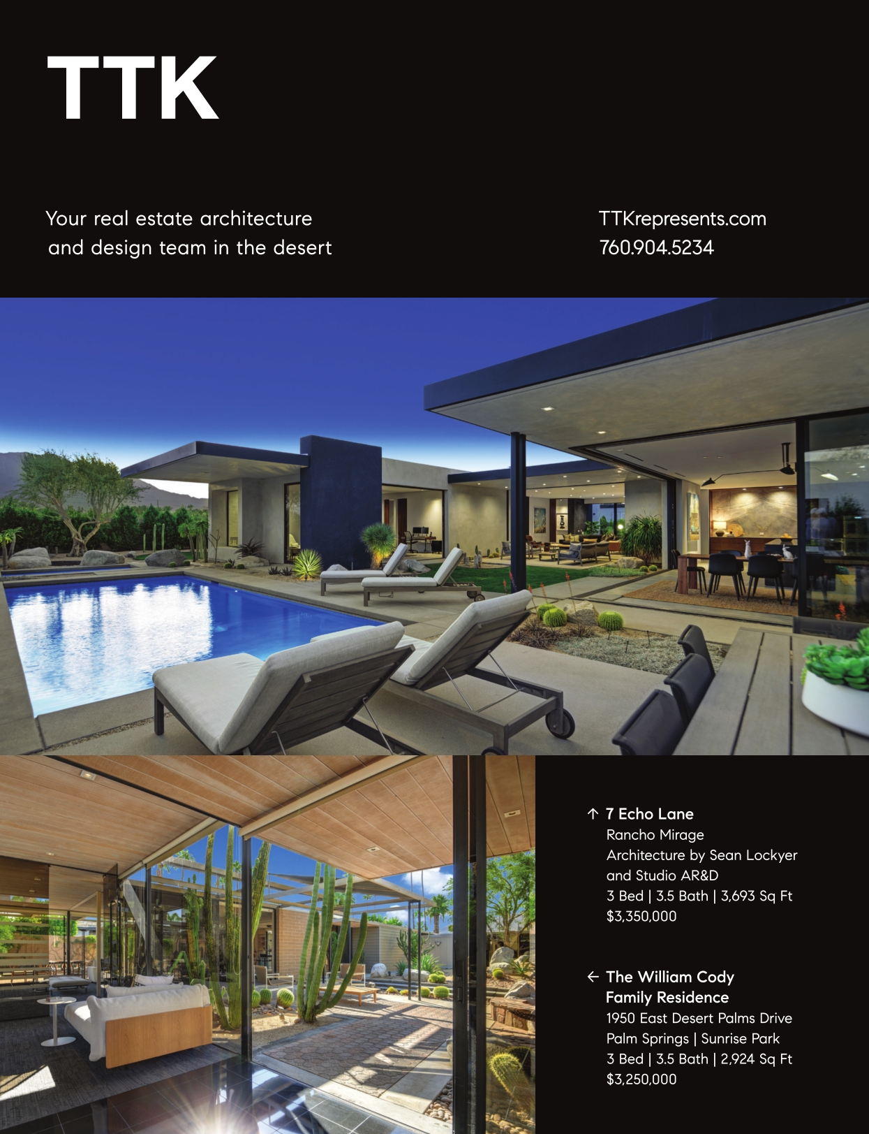 Your real estate architecture and design team in the desert TTKrepresents.com 760.904.5234 Perched on a hillside above the most desirable neighborhood of Little Tuscany, renowned composer Frederick Loewe’s former estate features landscaped grounds with lush and mature flora and fauna, an abundance of water features, and panoramic views of Palm Springs, the San Jacinto Mountains and the Coachella Valley beyond. 7 Echo Lane Rancho Mirage Architecture by Sean Lockyer and Studio AR&D 3 Bed | 3.5 Bath | 3,693 Sq Ft $3,350,000 The William Cody Family Residence 1950 East Desert Palms Drive Palm Springs | Sunrise Park 3 Bed | 3.5 Bath | 2,924 Sq Ft $3,250,000