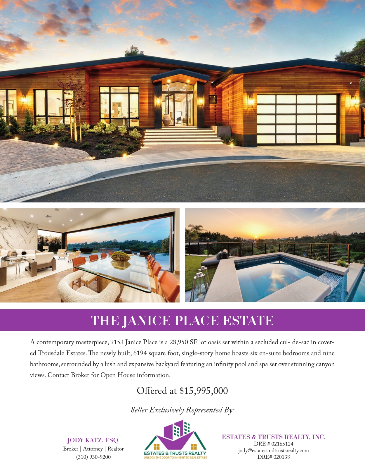 A contemporary masterpiece, 9153 Janice Place is a 28,950 SF lot oasis set within a secluded cul- de-sac in coveted Trousdale Estates. The newly built, 6194 square foot, single-story home boasts six en-suite bedrooms and nine bathrooms, surrounded by a lush and expansive backyard featuring an infinity pool and spa set over stunning canyon views. Contact Broker for Open House information.