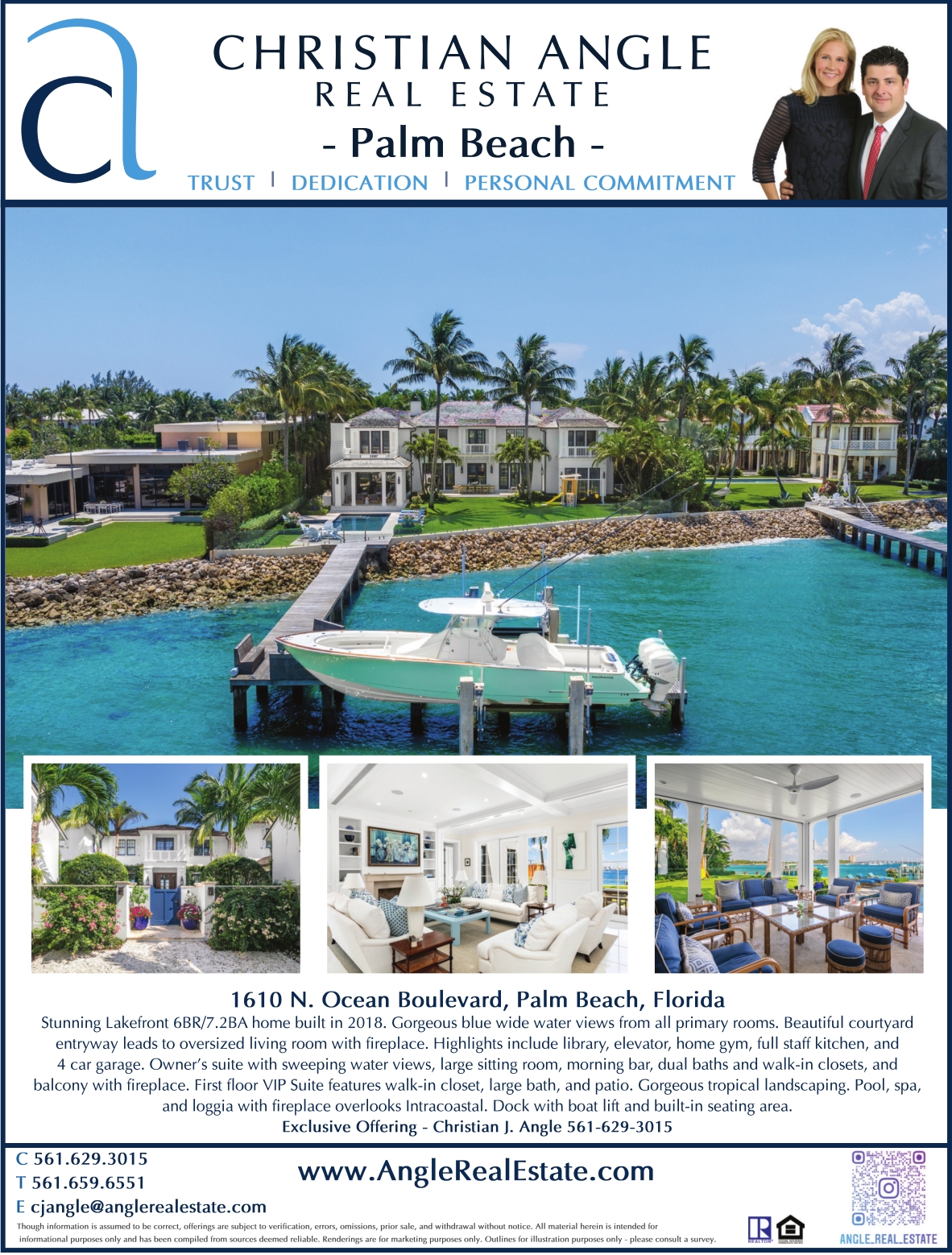 CHRISTIAN ANGLE REAL ESTATE - Palm Beach - TRUST | DEDICATION | PERSONAL COMMITMENT 1610 N. Ocean Boulevard, Palm Beach, Florida Stunning Lakefront 6BR/7.2BA home built in 2018. Gorgeous blue wide water views from all primary rooms. Beautiful courtyard entryway leads to oversized living room with fireplace. Highlights include library, elevator, home gym, full staff kitchen, and 4 car garage. Owner’s suite with sweeping water views, large sitting room, morning bar, dual baths and walk-in closets, and balcony with fireplace. First floor VIP Suite features walk-in closet, large bath, and patio. Gorgeous tropical landscaping. Pool, spa, and loggia with fireplace overlooks Intracoastal. Dock with boat lift and built-in seating area. Exclusive Offering - Christian J. Angle 561-629-3015 C 561.629.3015 T 561.659.6551 E cjangle@anglerealestate.com www.AngleRealEstate.com Though information is assumed to be correct, offerings are subject to verification, errors, omissions, prior sale, and withdrawal without notice. All material herein is intended for informational purposes only and has been compiled from sources deemed reliable. Renderings are for marketing purposes only. Outlines for illustration purposes only - please consult a survey.
