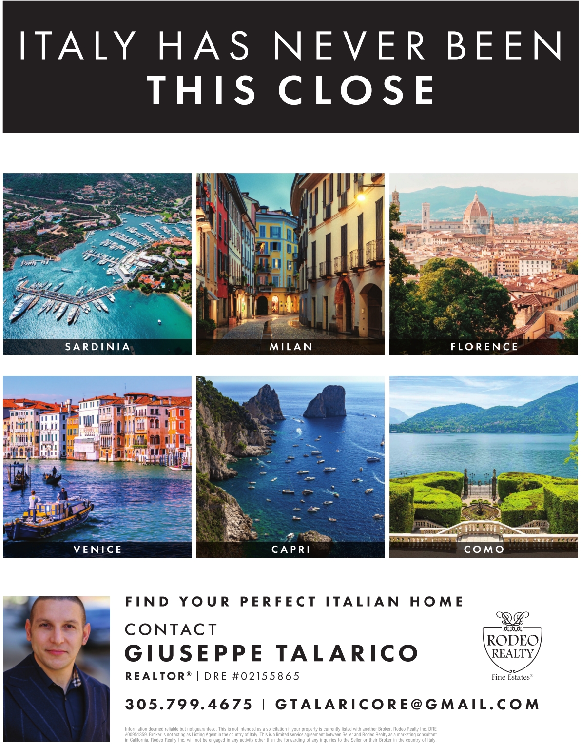 ITALY HAS NEVER BEEN THIS CLOSE SARDINIA MILAN FLORENCE VENICE CAPRI COMO FIND YOUR PERFECT ITALIAN HOME CONTACT GIUSEPPE TALARICO REALTOR® | DRE # 02155865 305.799.4675 | GTALARICORE@GMAIL.COM Information deemed reliable but not guaranteed. This is not intended as a solicitation if your property is currently listed with another Broker. Rodeo Realty Inc. DRE #00951359. Broker is not acting as Listing Agent in the country of Italy. This is a limited service agreement between Seller and Rodeo Realty as a marketing consultant in California. Rodeo Realty Inc. will not be engaged in any activity other than the forwarding of any inquiries to the Seller or their Broker in the country of Italy.