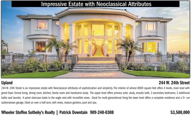 Impressive Estate with Neoclassical Attributes Upland 244 W. 24th Street 244 W. 24th Street is an impressive estate with Neoclassical attributes of sophistication and simplicity. The interior of almost 8000 square feet offers 4 levels, main level with grand foyer, formal living, dining room, kitchen, family room and handsome study. The upper level offers primary suite, study, ensuite bath, 3 secondary bedrooms, 2 additional baths and laundry. A spiral staircase leads to the eagle nest with incredible views. Great for multi-generational living the lower level offers a complete residence and a 5+ car subterranean garage. Sited on over a half-acre, with views, mature gardens, pool and spa. Wheeler Steffen Sotheby’s Realty | Patrick Downtain 909-240-0308 $3,500,000