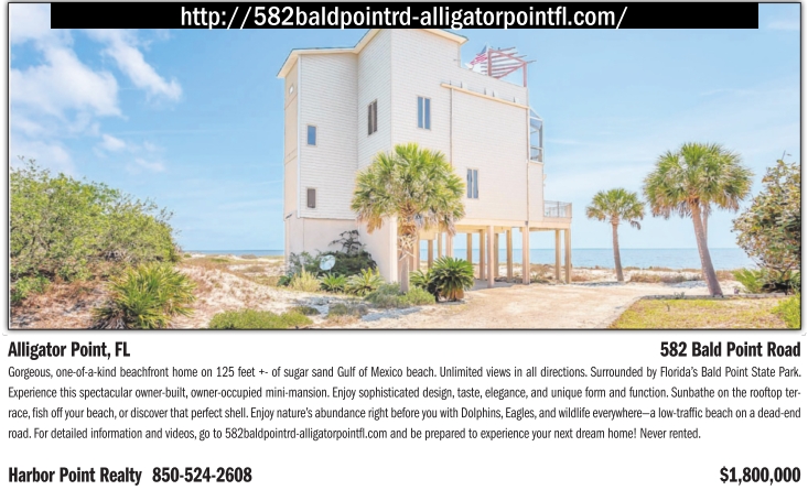 http://582baldpointrd-alligatorpointfl.com/ Alligator Point, FL 582 Bald Point Road Gorgeous, one-of-a-kind beachfront home on 125 feet +- of sugar sand Gulf of Mexico beach. Unlimited views in all directions. Surrounded by Florida’s Bald Point State Park. Experience this spectacular owner-built, owner-occupied mini-mansion. Enjoy sophisticated design, taste, elegance, and unique form and function. Sunbathe on the rooftop terrace, fish off your beach, or discover that perfect shell. Enjoy nature’s abundance right before you with Dolphins, Eagles, and wildlife everywhere—a low-traffic beach on a dead-end road. For detailed information and videos, go to 582baldpointrd-alligatorpointfl.com and be prepared to experience your next dream home! Never rented. Harbor Point Realty 850-524-2608 $1,800,000