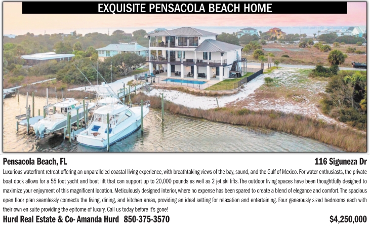 generously sized bedrooms each with their own en suite providing the epitome of luxury. Call us today before it’s gone! Hurd Real Estate & Co-Amanda Hurd 850-375-3570 $4,250,000