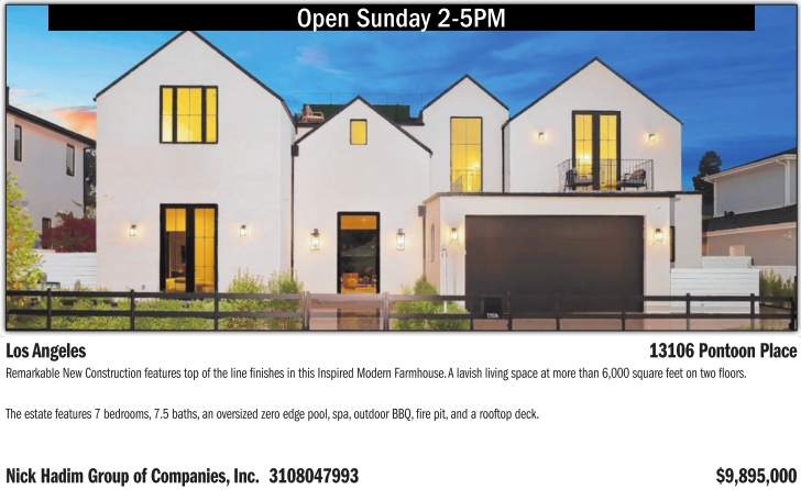 Open Sunday 2-5PM Los Angeles 13106 Pontoon Place Remarkable New Construction features top of the line finishes in this Inspired Modern Farmhouse. A lavish living space at more than 6,000 square feet on two floors. The estate features 7 bedrooms, 7.5baths, an oversized zero edge pool, spa, outdoor BBQ, fire pit, and a rooftop deck. Nick Hadim Group of Companies, Inc. 3108047993 $9,895,000
