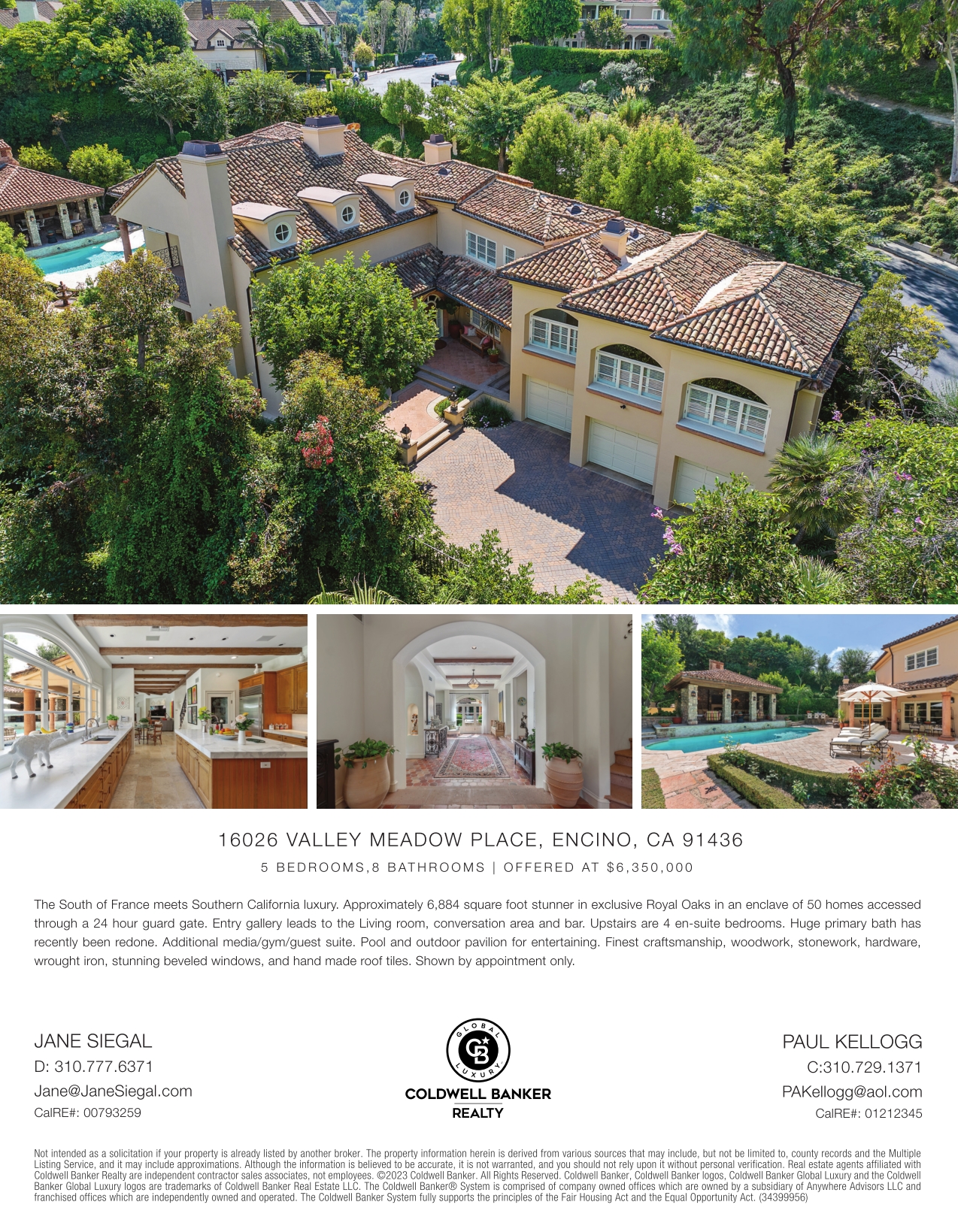 The South of France meets Southern California luxury. Approximately 6,884 square foot stunner in exclusive Royal Oaks in an enclave of 50 homes accessed through a 24 hour guard gate. Entry gallery leads to the Living room, conversation area and bar. Upstairs are 4 en-suite bedrooms. Huge primary bath has recently been redone. Additional media/gym/guest suite. Pool and outdoor pavilion for entertaining. Finest craftsmanship, woodwork, stonework, hardware, wrought iron, stunning beveled windows, and hand made roof tiles. Shown by appointment only.