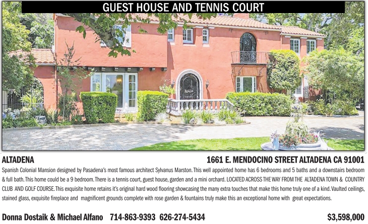 1661 E. MENDOCINO STREET ALTADENA CA 91001 Spanish Colonial Mansion designed by Pasadena’s most famous architect Sylvanus Marston. This well appointed home has 6 bedrooms and 5 baths and a downstairs bedroom & full bath. This home could be a 9 bedroom. There is a tennis court, guest house, garden and a mini orchard. LOCATED ACROSS THE WAY FROM THE ALTADENA TOWN & COUNTRY CLUB AND GOLF COURSE. This exquisite home retains it’s original hard wood flooring showcasing the many extra touches that make this home truly one of a kind. Vaulted ceilings, stained glass, exquisite fireplace and magnificent grounds complete with rose garden & fountains truly make this an exceptional home with great expectations. Donna Dostaik & Michael Alfano 714-863-9393 626-274-5434 $3,598,000