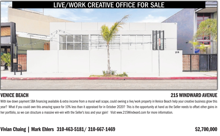 LIVE/WORK CREATIVE OFFICE FOR SALE VENICE BEACH 215 WINDWARD AVENUE With low down payment SBA financing available & atra income from a mural wall scape, could owing a live/work property in Venice Beach help your business grow this year? What if you could own this amazing space for 10% less than it appraised for in October 2020? This is the opportunity at hand as the Seller needs to offset other gains in her portfolio, so we can structure a massive win-win with the Seller's loss and your gain! Visit www.215Windward.com for more information.