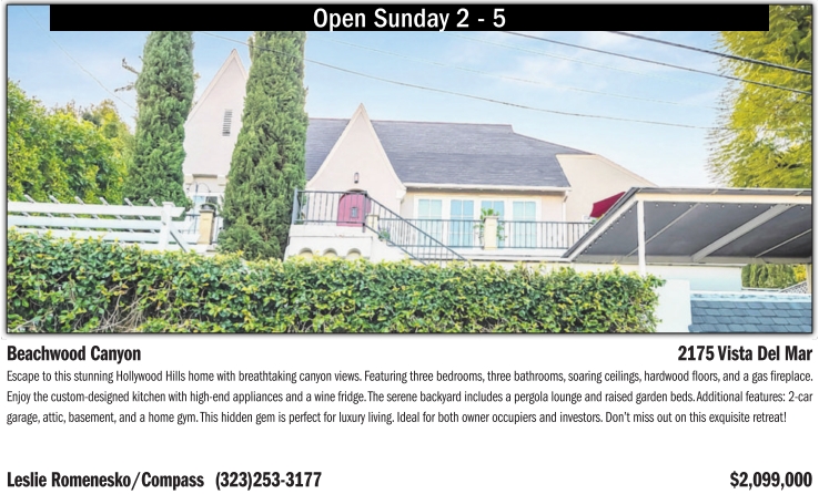 Escape to this stunning Hollywood Hills home with breathtaking canyon views. Featuring three bedrooms, three bathrooms, soaring ceilings, hardwood floors, and agas fireplace. Enjoy the custom-designed kitchen with high-end appliances and awine fridge. The serene backyard includes apergola lounge and raised garden beds. Additional features: 2-car garage, attic, basement, and ahome gym. This hidden gem is perfect for luxury living. Ideal for both owner occupiers and investors. Don’t miss out on this exquisite retreat! Leslie Romenesko/Compass (323)253-3177 $2,099,000