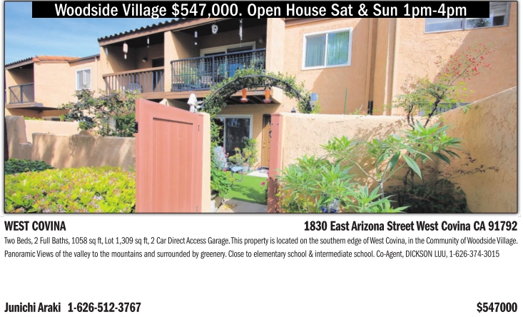 Woodside Village $547,000. Open House Sat & Sun 1pm-4pm WEST COVINA 1830 East Arizona Street West Covina CA 91792 Two Beds, 2 Full Baths, 1058 sq ft, Lot 1,309 sq ft, 2 Car Direct Access Garage. This property is located on the southern edge of West Covina, in the Community of Woodside Village. Panoramic Views of the valley to the mountains and surrounded by greenery. Close to elementary school & intermediate school. Co-Agent, DICKSON LUU, 1-626-374-3015 Junichi Araki 1-626-512-3767 $547000