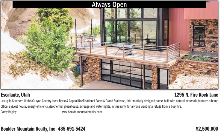 Luxury in Southern Utah’s Canyon Country. Near Bryce & Capitol Reef National Parks & Grand Staircase, this creatively designed home, built with natural materials, features a home office, a guest house, energy efficiency, geothermal greenhouse, acreage and water rights. A true rarity for anyone wanting a refuge from a busy life. Cathy Bagley www.bouldermountainrealty.com Boulder Mountain Realty, Inc 435-691-5424 $2,500,000