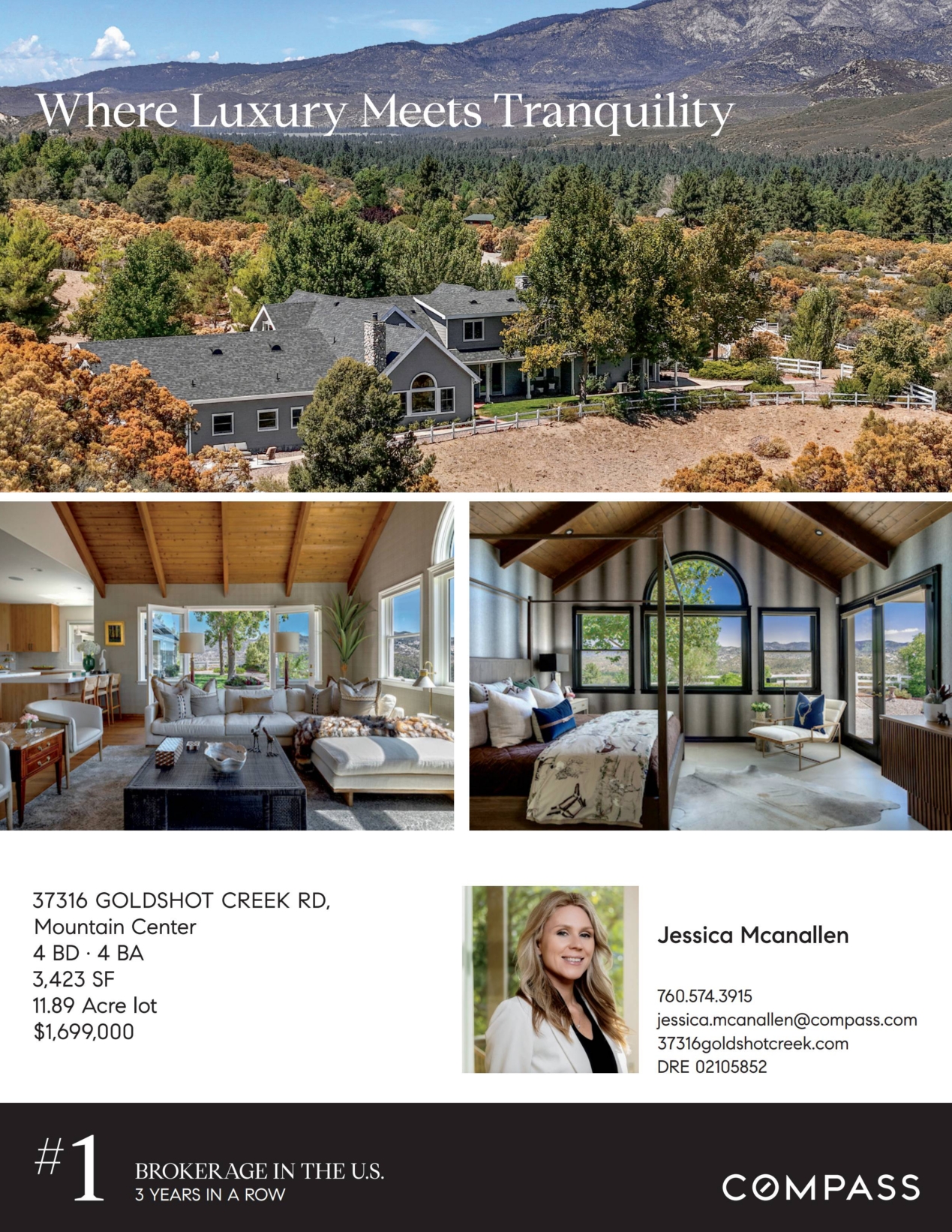 Where Luxury Meets Tranquility 37316 GOLDSHOT CREEK RD, Mountain Center 4 BD • 4 BA 3,423 SF 11.89 Acre lot $1,699,000 Jessica Mcanallen 760.574.3915 jessica.mcanallen@compass.com 37316goldshotcreek.com DRE 02105852 #1 BROKERAGE IN THE U.S. 3 YEARS IN A ROW COMPASS