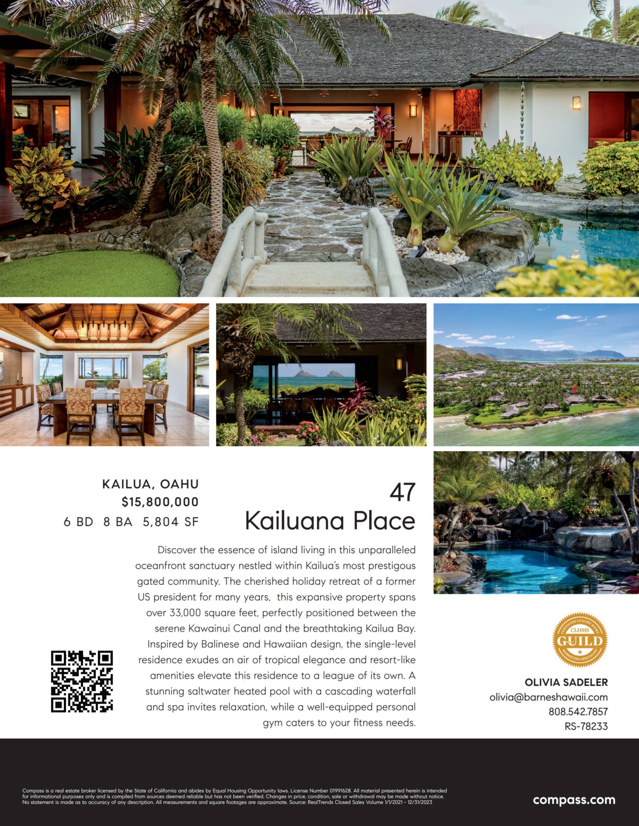 KAILUA, OAHU $15,800,000 6 BD 8 BA 5,804 SF 47 Kailuana Place Discover the essence of island living in this unparalleled oceanfront sanctuary nestled within Kailua's most prestigous gated community. The cherished holiday retreat of a former US president for many years, this expansive property spans over 33,000 square feet, perfectly positioned between the serene Kawainui Canal and the breathtaking Kailua Bay. Inspired by Balinese and Hawaiian design, the single-level residence exudes an air of tropical elegance and resort-like amenities elevate this residence to a league of its own. A stunning saltwater heated pool with a cascading waterfall and spa invites relaxation, while a well-equipped personal gym caters to your fitness needs. OLIVIA SADELER olivia@barneshawaii.com 808.542.7857 RS-78233