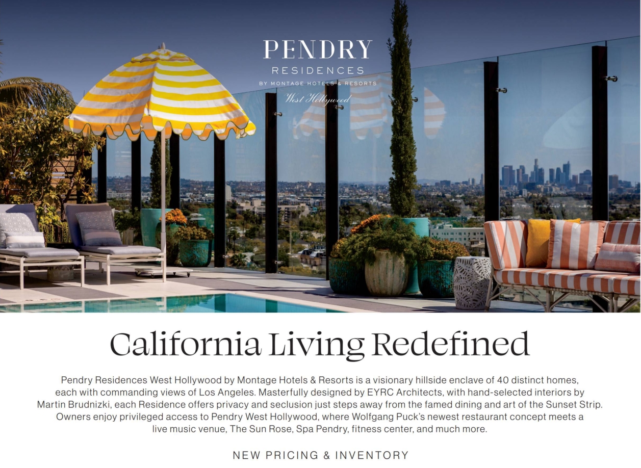 California Living Redefined Pendry Residences West Hollywood by Montage Hotels & Resorts is a visionary hillside enclave of 40 distinct homes, each with commanding views of Los Angeles. Masterfully designed by EYRC Architects, with hand-selected interiors by Martin Brudnizki, each Residence offers privacy and seclusion just steps away from the famed dining and art of the Sunset Strip. Owners enjoy privileged access to Pendry West Hollywood, where Wolfgang Puck’s newest restaurant concept meets a live music venue, The Sun Rose, Spa Pendry, fitness center, and much more. NEW PRICING & INVENTORY