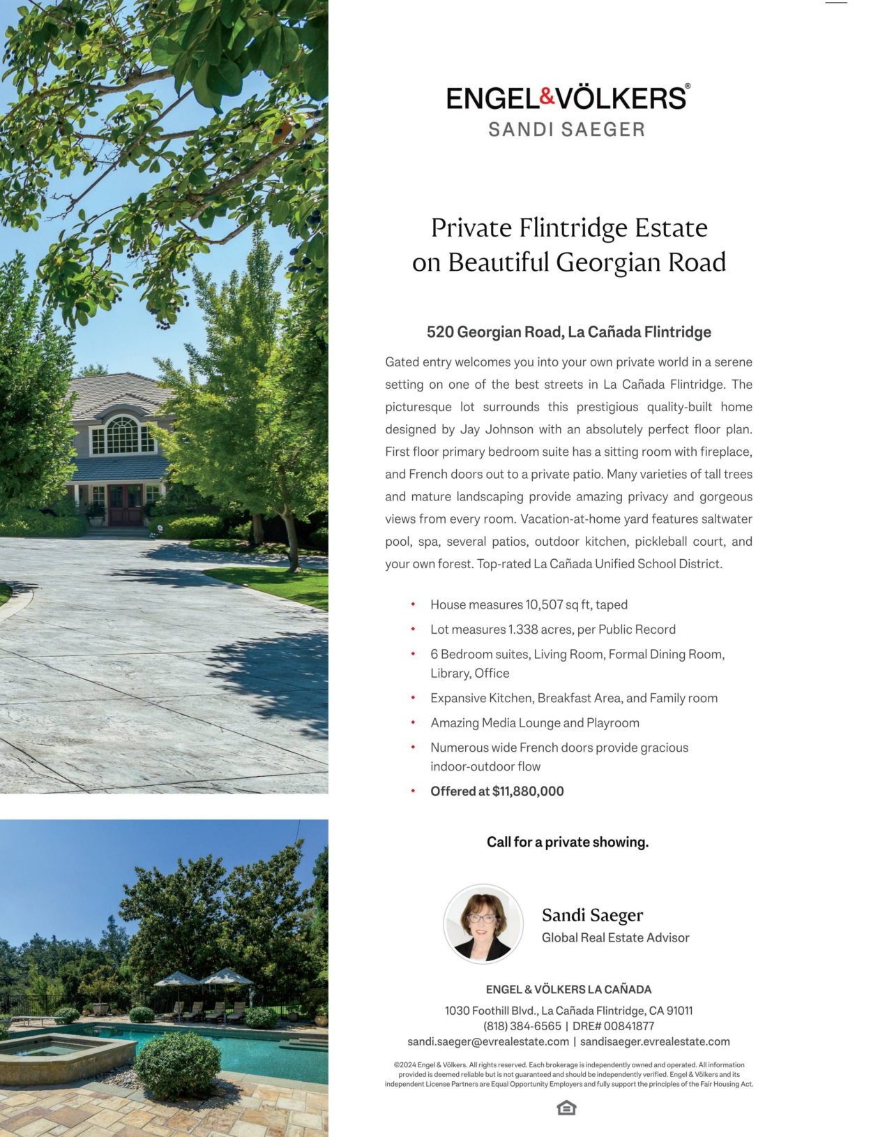 ENGEL&VÓLKERS SANDI SAEGER Private Flintridge Estate on Beautiful Georgian Road 520 Georgian Road, La Cañada Flintridge Gated entry welcomes you into your own private world in a serene setting on one of the best streets in La Cañada Flintridge. The picturesque lot surrounds this prestigious quality-built home designed by Jay Johnson with an absolutely perfect floor plan. First floor primary bedroom suite has a sitting room with fireplace, and French doors out to a private patio. Many varieties of tall trees and mature landscaping provide amazing privacy and gorgeous views from every room. Vacation-at-home yard features saltwater pool, spa, several patios, outdoor kitchen, pickleball court, and your own forest. Top-rated La Cañada Unified School District. House measures 10,507 sq ft, taped Lot measures 1.338 acres, per Public Record 6 Bedroom suites, Living Room, Formal Dining Room, Library, Office Expansive Kitchen, Breakfast Area, and Family room Amazing Media Lounge and Playroom Numerous wide French doors provide gracious indoor-outdoor flow Offered at $11,880,000