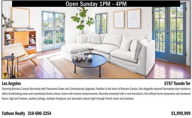 Open Sunday 1PM - 4PM Los Angeles 5767 Tuxedo Ter Stunning Bronson Canyon Normandy with Panoramic Views and Contemporary Upgrades. Nestled in the heart of Bronson Canyon, this elegantly restored Normandy-style residence offers breathtaking views and seamlessly blends classic charm with modern enhancements. Recently renovated with anew foundation, this refined home showcases oak hardwood floors, high-end finishes, vaulted ceilings, multiple fireplaces and abundant natural light through French doors and windows Fathom Realty 310-600-3254 $1,999,999